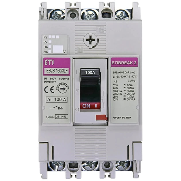 ETI EB2S 160/3LF 100A 3p (16kA) - автоматичний вимикач призначений для захисту кабелів, живильних ліній, двигунів та іншого електротехнічного обладнання від впливу струмів короткого замикання та перевантаження. Пристрій здатен відключити коротке замикання з піковим струмом до 16 кілоампер, що гарантує високий рівень захисту. Зручні клеми та кріпильні елементи забезпечують швидкий і легкий монтаж. Вимикач відповідає міжнародним стандартам якості та безпеки, що підтверджує його надійність і ефективність.