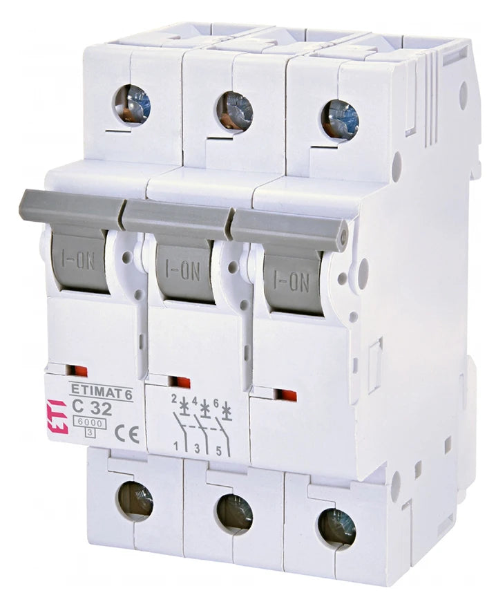 Трьохполюсний автоматичний вимикач ETI належить до серії автоматичних вимикачів ETIMAT 6 для захисту електричних ланцюгів змінного струму від перевантаження і короткого замикання. Спеціалізується для застосування в офісних будівлях, торгових центрах, виробництвах невеликого масштабу, житлово-комунальних секторах і приватних будинках. Пристрій відповідає нормам і стандартам IEC 60898, EN 60898, IEC 60947-2. Технічні особливості: - Індикація On/Off на рукоятці; - Можливість пломбування в положенні On/Off; - Червоний - зелений індикатор положення контактів; - Захист клем від випадкового дотику; - Одночасне підключення шини живлення і провідника (зверху/знизу); - Тип кріплення на шину: ТН 35; - Можливість монтажу додаткових аксесуарів; - Характеристики відключення: C; - Електромагнітний расцепитель, що захищає від короткого замикання; - Тепловий расцепитель - захист від перевантажень. Технічні характеристикиелектричні: - Номінальна частота: 50/60 Гц; - Змінний струм: 400 В; - Номінальний струм: 32 А; - Клас обмеження енергії: 3; - Крива відключення: C; - Номінальний піковий перенапруження: 4 кВ (1,2/50 мкс; - Номінальна напруга ізоляції: 500 В; - Довгочасність комутаційних циклів: електро. 8000, мех. 20 000; - Номінальна напруга: 60 В (на полюс). механічні: - Силові контакти покриті сріблом; - Усі струмопровідні частини зроблені з міді; - Ширина приладу: 17,6 мм на полюс; - Ступінь захисту: IP20; - Дугогасительная камера складається з 12 пластин; - Захист затискачів від дотику пальцями і руками; - Керамічна ізолює перегородка; - Перетин затискачів: 1-25 мм ², макс. 3 Нм; - Комбінований механізм скидання; - Монтаж: на шину TH 35 (EN 60715, EN 50022); - Стандарти: IEC 60898, EN 60898, IEC 60947-2; - Випробування на вібростійкість (IEC 60068-2-7); - Діапазон робочих температур: -25 ° C .... + 50 ° C.
