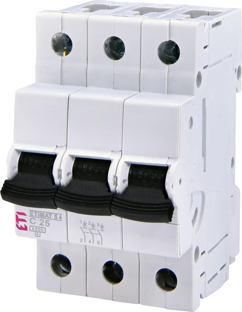 ETI ETIMAT S4 3p C 25A (4,5 kA) – трьохполюсний автоматичний вимикач розрахований на номінальний струм 25 А, що робить його ідеальним для використання у стандартних електромережах житлових та комерційних приміщень. Характеристика відключення типу C, забезпечує надійний захист від перевантажень і коротких замикань в електричних ланцюгах з помірними пусковими струмами. Механічна зносостійкість 20000 циклів гарантує надійну роботу протягом багатьох років, а підключення проводів з перерізом від 1 до 25 мм² забезпечує гнучкість в монтажі.