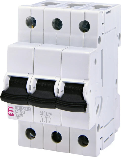 ETI ETIMAT S4 3p C 50A (4,5 kA) – трьохполюсний автоматичний вимикач розрахований на номінальний струм 50 А, що робить його ідеальним для використання у стандартних електромережах житлових, комерційних та виробничих приміщень. Характеристика відключення типу C, забезпечує надійний захист від перевантажень і коротких замикань в електричних ланцюгах з помірними пусковими струмами. Механічна зносостійкість 20000 циклів гарантує надійну роботу протягом багатьох років, а підключення проводів з перерізом від 1 до 25 мм² забезпечує гнучкість в монтажі.