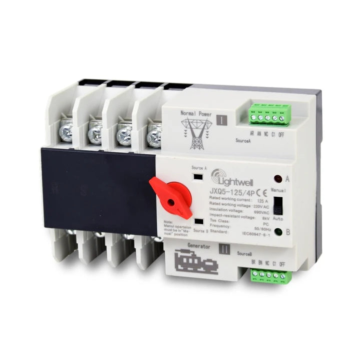 Lightwell ATS 4P 125A для DIN-рейки — це побутовий подвійний автоматичний перемикач передачі електроенергії, який застосовується для автоматичного захисту споживачів електричної енергії від короткого замикання і відключається при появі надструмів. Може служити для ручного оперативного втручання в постачання мережі. Встановлюється в житлових і адміністративних будівлях у групових і обліково-розподільних щитках. Перемикач використовується для перевірки нормального стану основного або резервного джерела живлення. У разі порушення нормального живлення резервне джерело живлення негайно починає працювати, щоб забезпечити безперервність, надійність і безпеку електропостачання. Пристрій спеціально розроблено для побутової установки і використовується в розподільній коробці живлення. Автоматичний перемикач підходить для системи аварійного електропостачання зі змінним струмом 50 або 60 Гц. Має компактну структуру, надійний у передачі, зручний в установці та обслуговуванні, має тривалий термін служби. Широко використовується в різних випадках, коли не допускається безперервне відключення електроенергії, може управлятися як електрично, так і вручну.