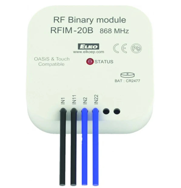 Універсальний передавальний модуль iNELS RFIM-20B призначений для перетворення звичайного проводового вимикача в бездротової. Компактно встановлюється в коробку за існуючому вимикачем. Передає сигнал по радіоканалу на відкритому просторі, а також через цегляні та залізобетонні стіни, гіпсокартонні, дерев'яні, металеві та скляні конструкції. Підтримує 6 світлових функцій (включення/вимикання, що настроюється плавне разгорание/затухання світла.