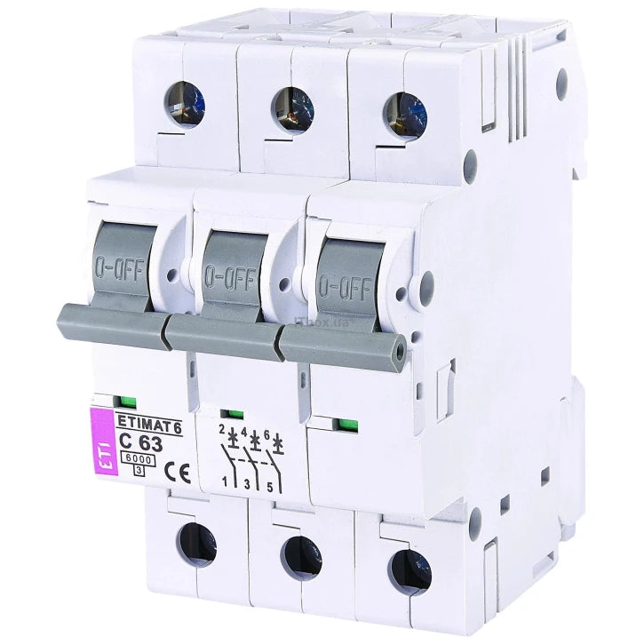 Трьох полюсний автоматичний вимикач ETI належить до серії автоматичних вимикачів ETIMAT 6 для захисту електричних ланцюгів змінного струму від перевантаження і короткого замикання. Спеціалізується для застосування в офісних будівлях, торгових центрах, виробництвах невеликого масштабу, житлово-комунальних секторах і приватних будинках.