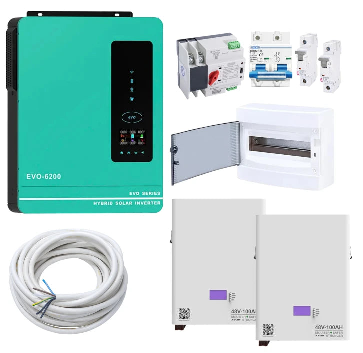 Комплект резервного живлення Anern AN-SCI-EVO6200 6200W (АКБ 2 x LiFePO4 4800Wh) є ідеальним рішенням для забезпечення надійного резервного живлення вашого будинку, офісу або об'єкту.Підходить для квартири та запустить будь-які прилади до 6 КВт:телевізори, роутери, тюнери;холодильники, мікрохвильові печі;електроплити, духові шафи;посудомийні та пральні машини;кондиціонери;бойлери;фени та плойки;насоси та компресори.До комплекту входить:Гібридний інвертор 1 ф 6 кВт 48 В - 1 шт.Акумулятор 48 В 100 Аг тип LiFePo4 - 2 шт.Кабель для АКБ з клемами 25 мм2 х 1 м - 2 шт.Кабель для АКБ з клемами 25 мм2 х 0,25 м - 3 шт.Кабель силовий - 10 м.Автомат постійного струму - 1 шт.Автомат електричний - 2 шт.Автоматичний ввід резерву - 1 шт.Навісний пластиковий щит 12 - модульний - 1 шт.Монтажний комплект.Найновіший гібридний інвертор Anern AN-SCI-EVO6200 - це високоефективне та доступне рішення для генерації електроенергії за допомогою сонячних панелей. Завдяки чистому синусу та потужності 6200 Вт, цей інвертор забезпечує стабільне та надійне живлення для вашого житла. Його унікальна особливість полягає в тому, що для його роботи достатньо лише одного 48В акумулятора, що робить його ідеальним рішенням для квартир та невеликих домівок.Цей гібридний інвертор дозволяє підключати до 5 сонячних панелей, максимізуючи виробництво зеленої енергії. Його здатність працювати при частотах 50Гц/60Гц та надавати стабільну вихідну напругу 230В робить його відмінним вибором для забезпечення житлових приміщень електроенергією. Робочі параметри можна переглядати безпосередньо на дисплеї.Широкий діапазон вхідної напруги:Максимальна вхідна потужність сонячної енергії 6500 Вт.Широкий діапазон вхідної напруги PV (60-500 В постійного струму).Здатність до тривалої роботи:Сумісний з літієвими, гелевими та кислотними акумуляторами.Інтелектуальна зарядка батареї, призначена для максимального збільшення терміну служби батареї.Додатково, для зручності управління та моніторингу функцій інвертора, доступний WiFi модуль керування, який може бути замовлений окремо. Це дозволяє вам віддалено контролювати та налаштовувати роботу інвертора з будь-якого місця, забезпечуючи максимальний рівень зручності та ефективності в експлуатації.Основні характеристики інвертора:Форма вихідної напруги: Чиста синусоїдаНомінальна потужність: 6200 ВтПотужність: 12400 ВАЧастота мережі: 50/60 ГцВхідна напруга: 170-280VAC (UPS) або 90-280VAC (споживачі)Вихідна напруга: 230VAC ± 5%Вибір діапазону напруги: 195.5-253VACЧас переключення: 10мс (UPS), 20мс (споживачі)Підтримка сонячних панелейТип контроллера: MPPTСтрум заряду від сонячних панелей: 100 АМаксимальний струм заряду: 120 АДіапазон напруг MPPT: 90 ~ 450 VDCНапруга акумулятора: 48 ВДіапазон робочих температур: -10 ° C ~ + 50 ° CРозміри: 450 х 350 х 110 ммВага: 10 кг